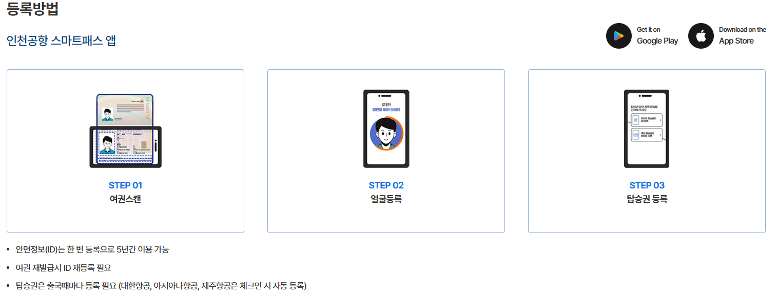 - App Store 또는 Google Play에서 ‘인천공항 스마트패스’ 앱 다운로드